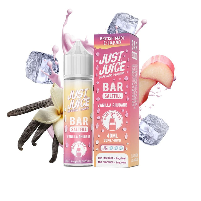 Vanilla Rhubarb by Just Juice Bar Saltfill brings you bold and punchy rhubarb with a sweet and creamy vanilla note to compliment.